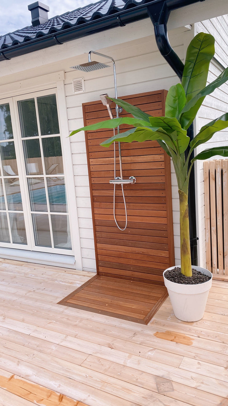 Utedusch med träribbor och elegant integrering. Praktisk, hållbar och vacker — perfekt för poolområdet eller sommarens utomhusliv.