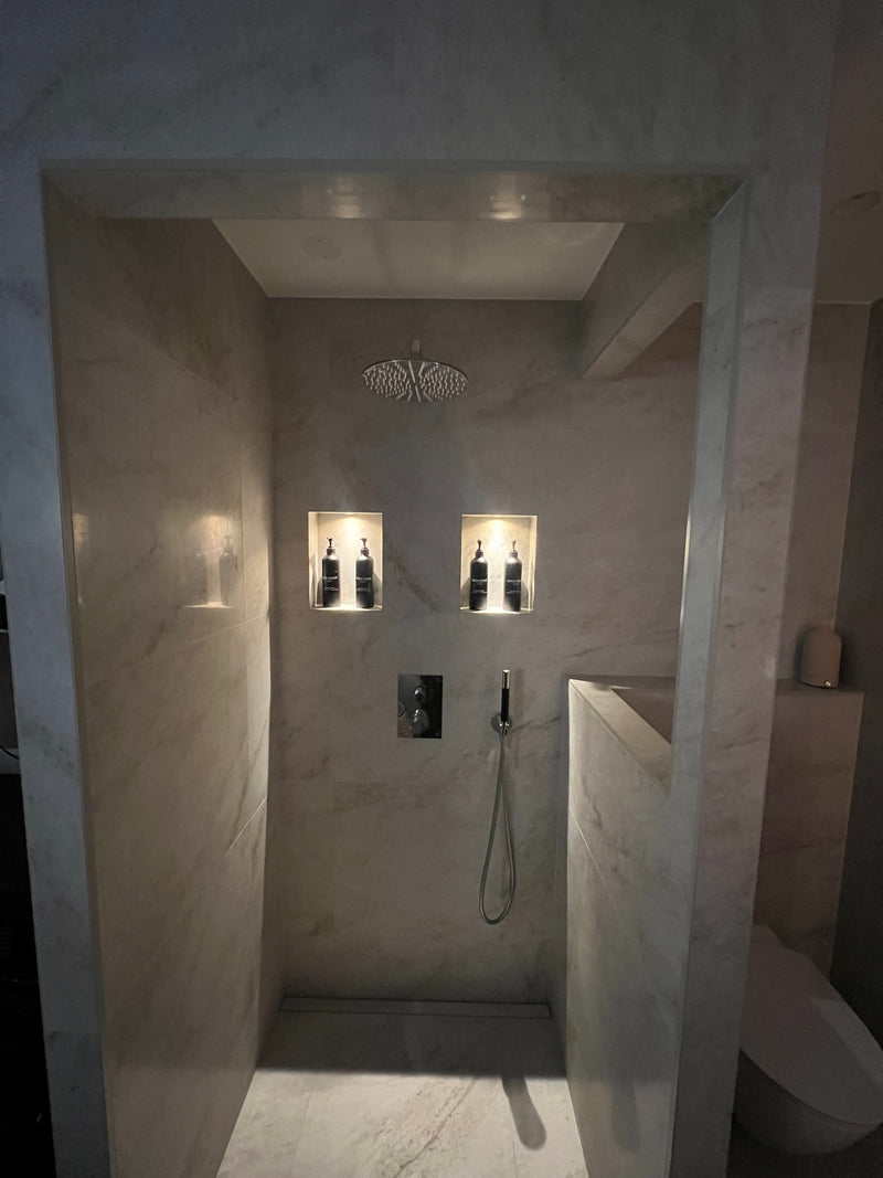 En stilren duschlösning i natursten där nischer med LED-belysning skapar både funktion och elegans