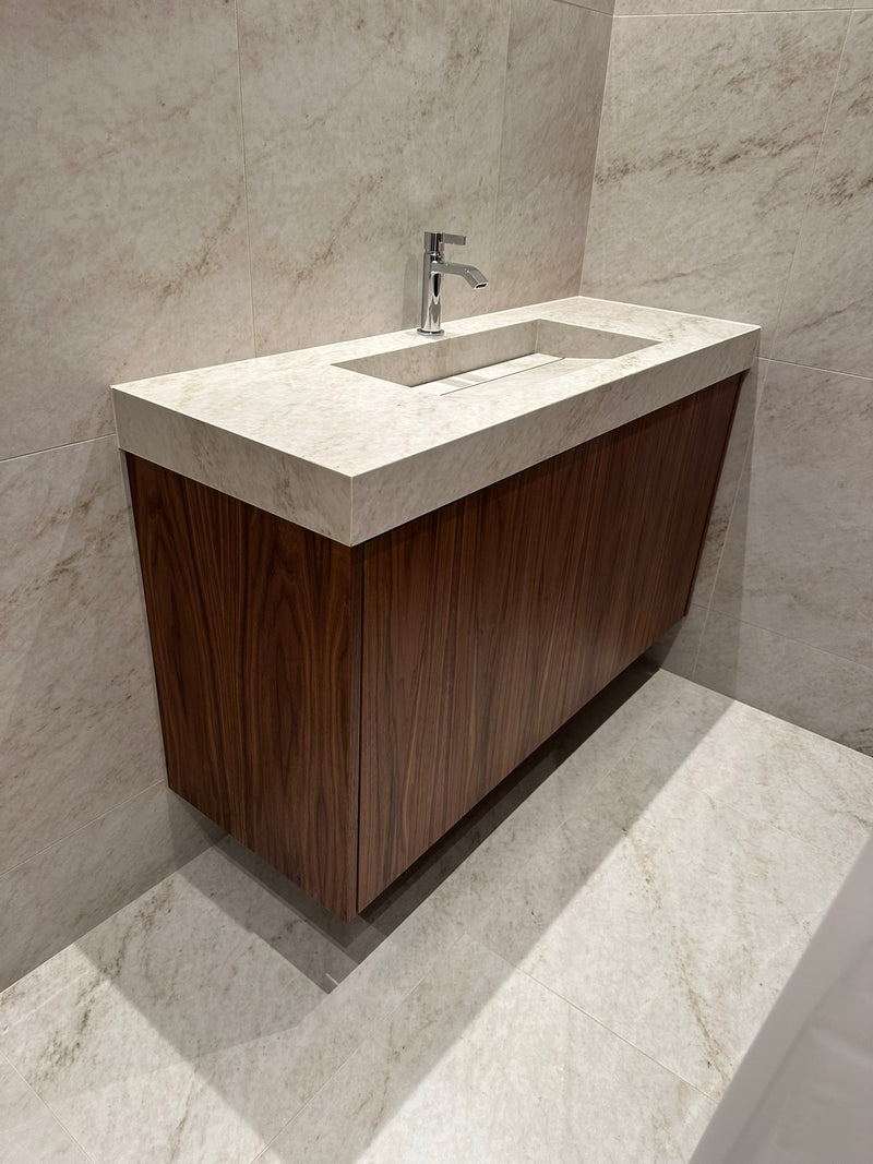 Kommod i valnöt med integrerad stenskiva – en stilren och elegant lösning som kombinerar varma träslag med exklusiva materialval