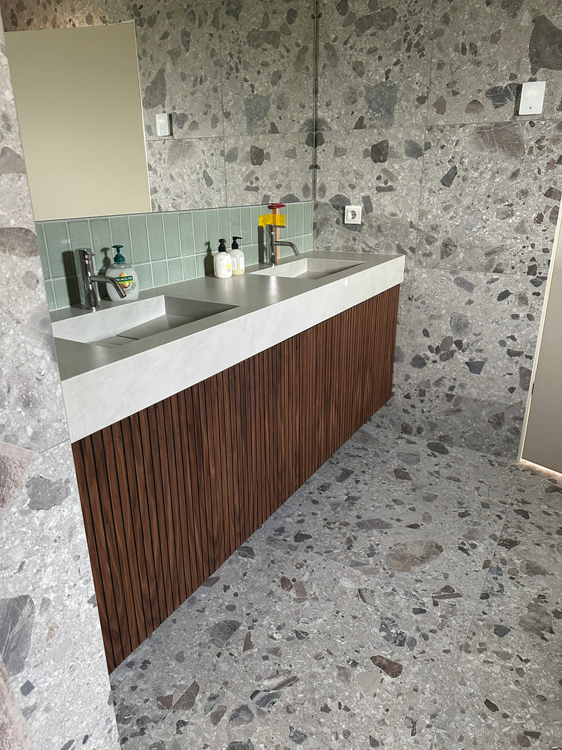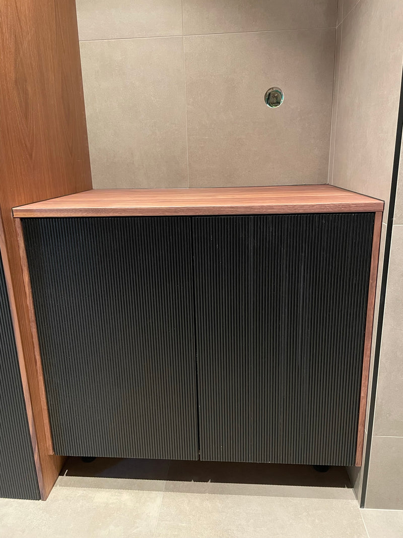 Platsbyggd kommod med ribbad front i trä och generös förvaring, toppad med en stilig stenskiva för ett lyxigt och modernt uttryck.