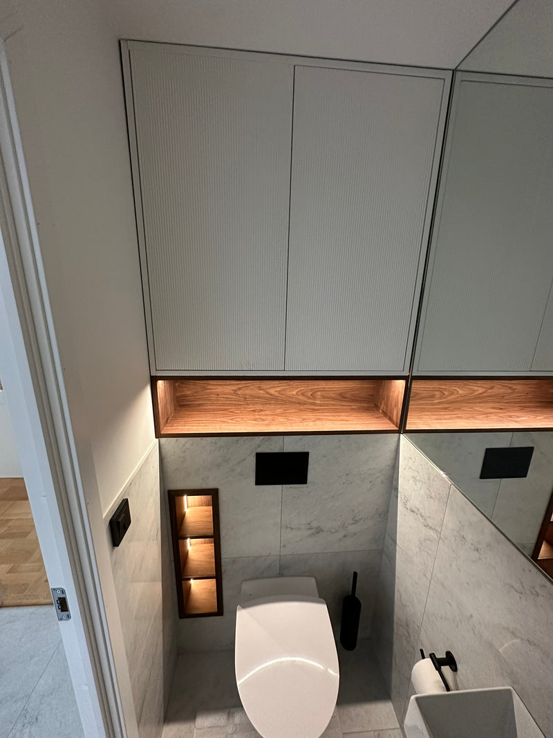 Smarta hyllor och platsbyggda förvaringslösningar som enkelt smälter in i badrummets arkitektur. Genomtänkta nischer, integrerad belysning och måttanpassade skåp skapar både ordning och en ren, modern känsla.