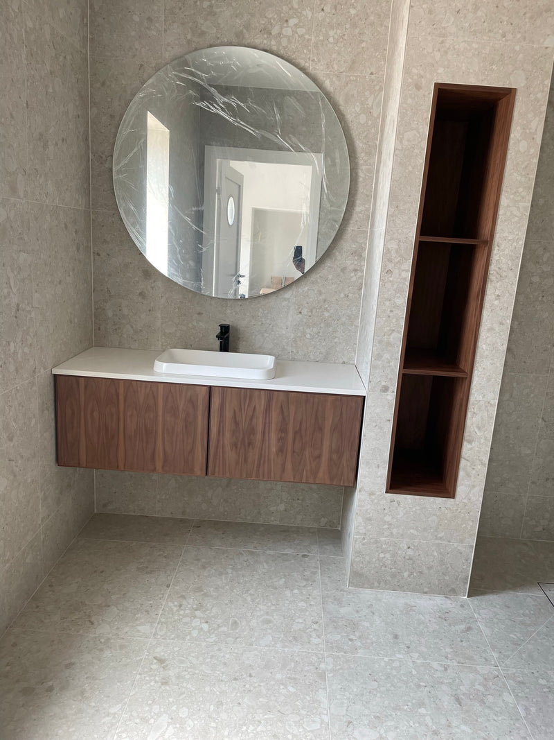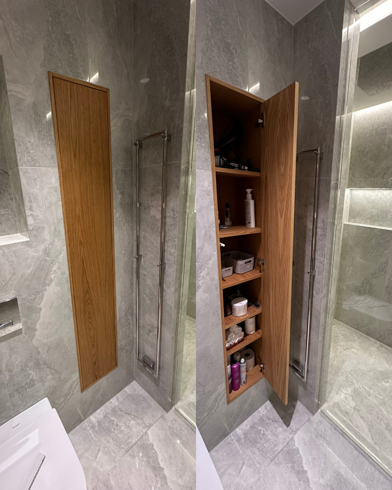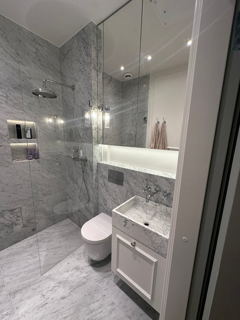 Platsbyggda hyllor och nischer som integreras i dusch eller våtzon. Praktiska och slitstarka lösningar som ger en organiserad känsla utan att ta över visuellt.