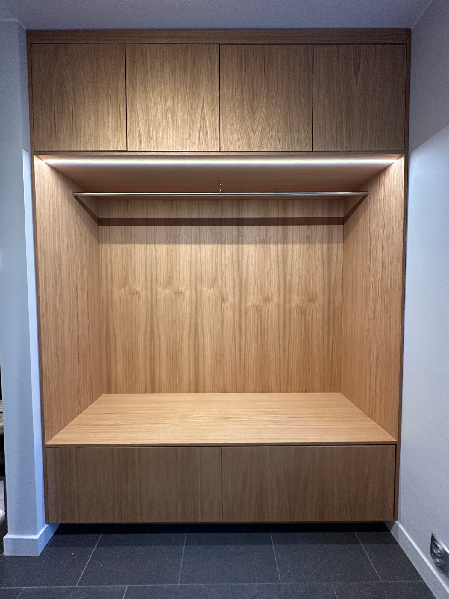 Platsbyggda hallösningar som kombinerar sittbänk, dold förvaring och genomtänkta detaljer. Med integrerade krokar, skåp, ribbväggar och belysning skapas en organiserad och välkomnande entré där allt har sin plats. Varje lösning anpassas efter hallens mått och behov — från förvaring av skor och ytterkläder till praktiska ytor för vardagens avlastning.
