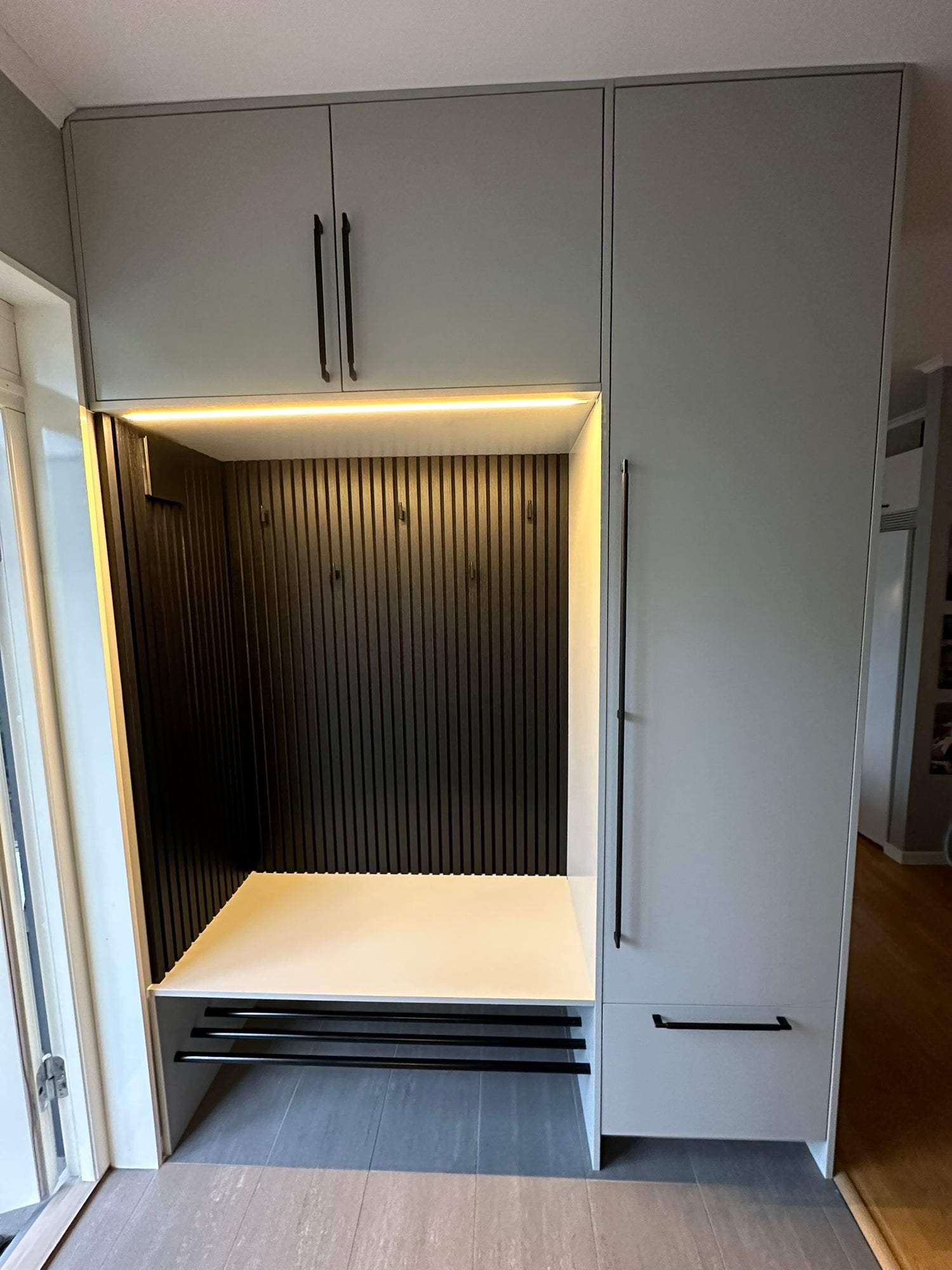 Modern platsbyggd hall med integrerad sittbänk, skoförvaring och dold LED-belysning. Den ribbade fonden skapar djup och karaktär medan belysningen ger både överblick och en exklusiv känsla.