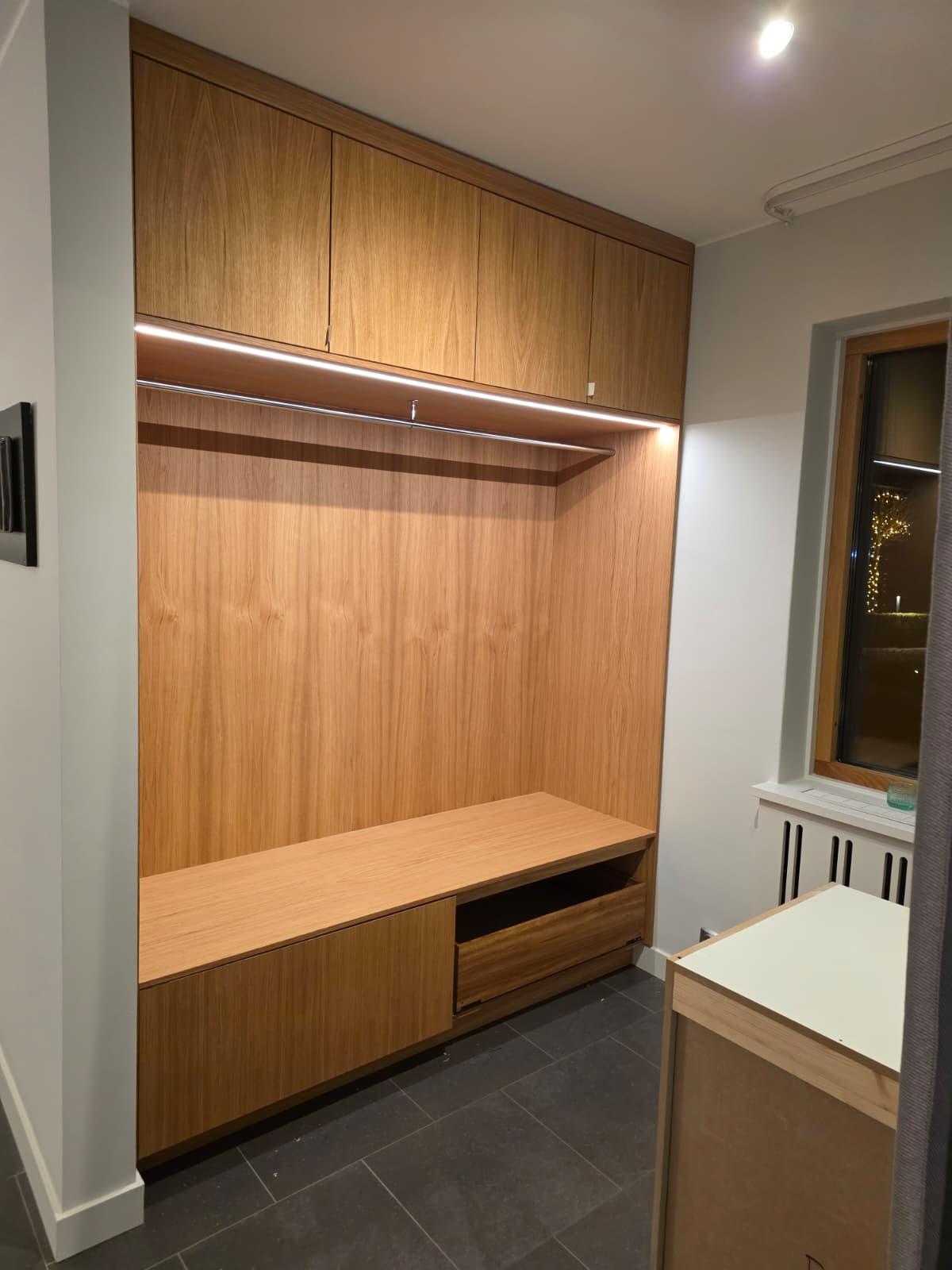 Platsbyggd hallmöbel i massiv ek med integrerad belysning