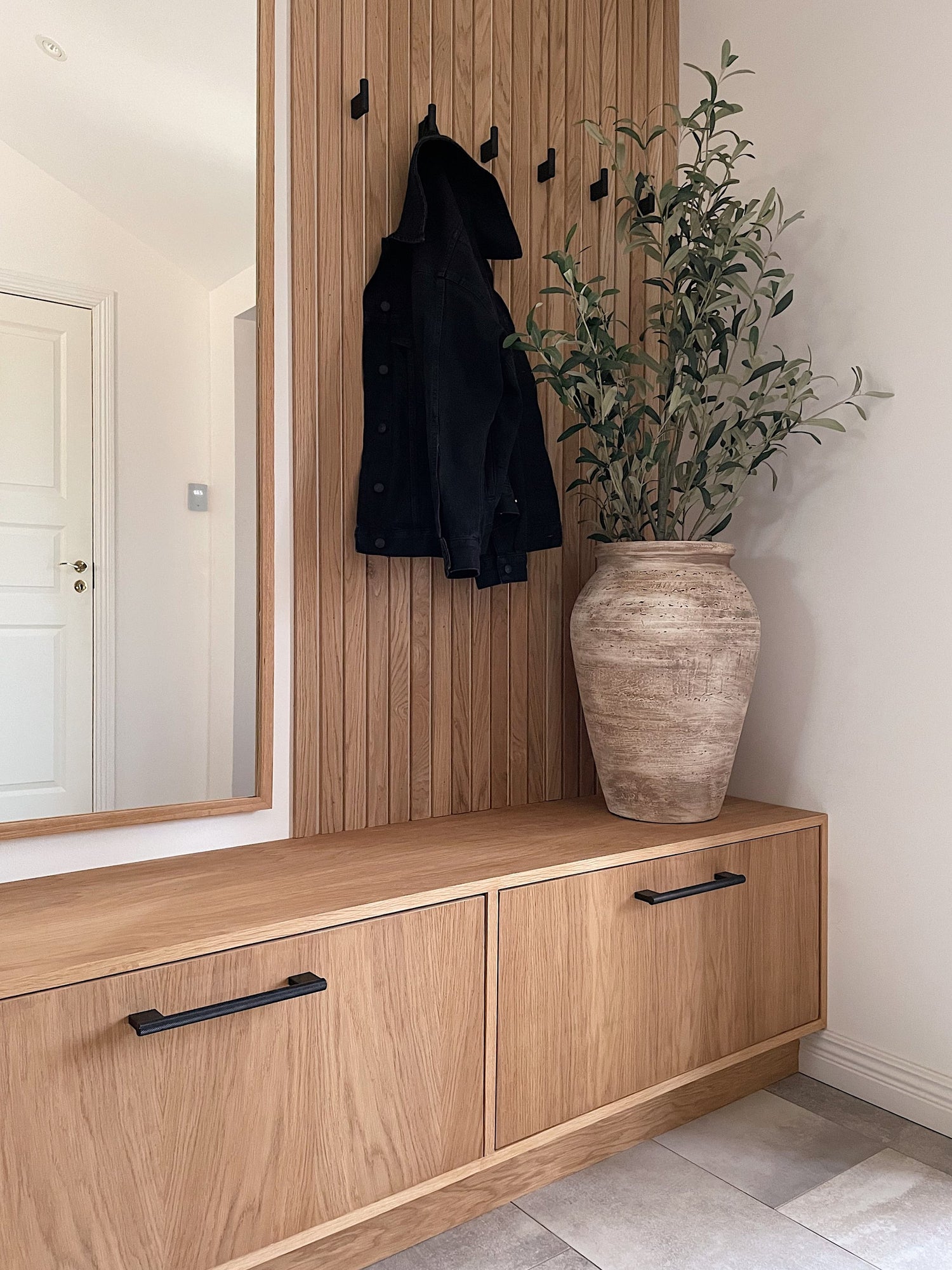 Naturmaterialen och de rena linjerna skapar en tidlös hall som är både funktionell och estetiskt genomtänkt – perfekt för en organiserad och stilren entré.