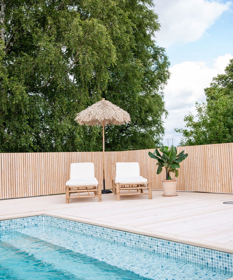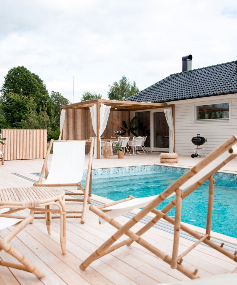 Elegant poolområde med skräddarsytt staket och avkopplande solytor