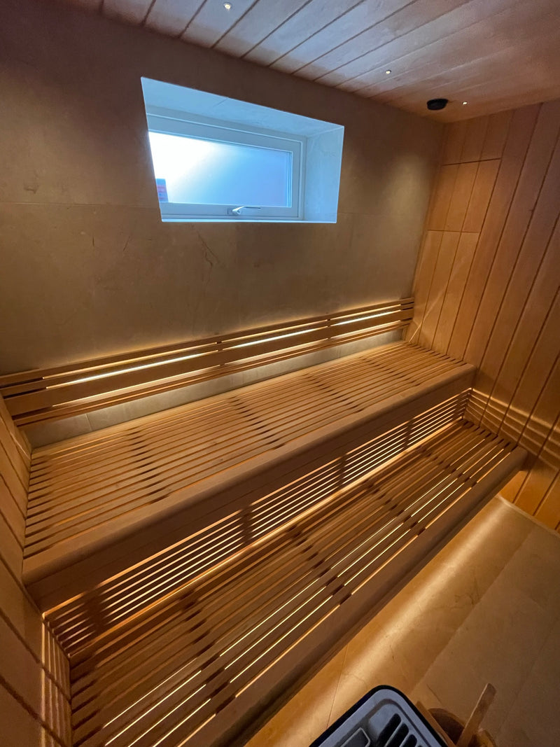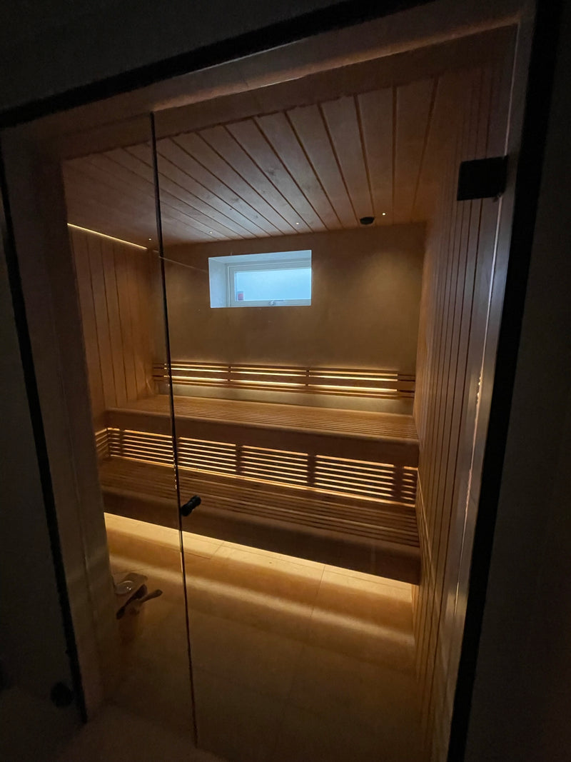 Skräddarsydd bastu med glasfront och dolt ljus under lavarna för en modern och inbjudande atmosfär